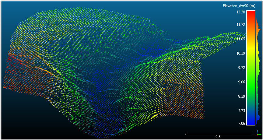 LiDAR has the potential to be used for measuring the depths of relatively shallow water bodies, such as streams, from the air. In the first image on the left, there is an overview of a stream with a small water height and overhanging vegetation. Subsequently, vegetation is removed via classification and the Digital Terrain model is generated as shown in the second image.