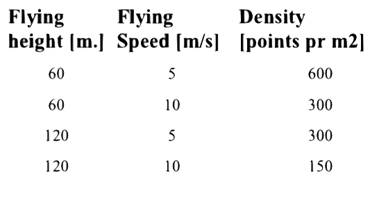 The LiDAR sensor we are using provides 240.000 points pr. sec. and operates with a laser wavelength at 905 nm. Class 1 (IEC 60825-1:2014). Dual and triple target detection is possible in order to distinguish between top of vegetation and the terrain.
